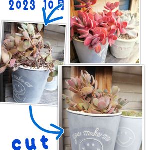 本日2投目😁 斑入りのミセバヤなのにどんどん斑入り部分が消えてきました。 先祖返りが止まらない😳 そしてボサボサ💨💨💨 斑なしをカットして普通のミセバヤの方に挿しました。左下↙️ カット✂️後だいぶ寂しくなっちゃいました~ 右下↘️