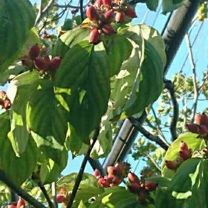 歩道を歩きながら、ふと見上げると、ハナミズキが赤く色づいていました😊