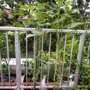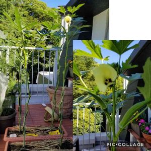 雨が減ったら急にオクラの成長が早くなってきました🎵 そしてもうひょろひょろと120cmに‼ 明日台風来たら折れちゃうね もっと太い支柱買ってこなきゃダメかな。今もちょっとの風でゆらゆら危ない。