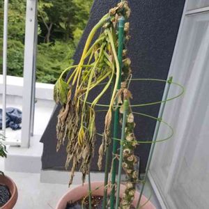 しばらく家を空けていたらこんな事に⤵ 雨で先の方が折れたみたいです。もう実は成りそうに無かったので仕方ない。