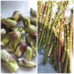 タラの芽とイタドリ 旦那さんとその友達で沢山採ってきてくれまし。タラの芽は天ぷらにして頂きました。イタドリは塩漬けにしてます。イタドリの事を私の地方では「ごんぱち」といいます。