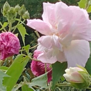 我が家に初めて来た芙蓉 3㍍程に成長し沢山の花を咲かせてくれています。 八重の芙蓉です。 ↘️右下の一重の芙蓉は八重からの零れ種の🌱からの開花です。 マイガーデン