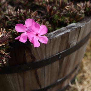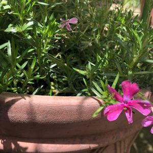 今日のお花シバザクラ🌸 雨続きで心配しましたが2輪咲いてました。もっと咲いてくれると良かったんですが、少なくても嬉しいです。咲いてくれて感謝感謝😊 ダニエルクッションとキャンディストライプという名前があります。写真はダニエルクッションの方です🤗藤の花の下の大きな植木鉢に植わってます😊