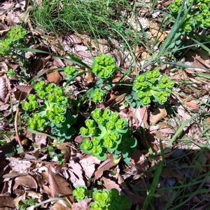 道端にトウダイグサが咲いていました。お椀のような包葉に小さな雌花と雄花が包まれてます(杯状花序)雌花は子房がついてるから分かり易いですが、雄花は雌花の基部に見える点々かな? 高さはそれほどでもなく、ホトケノザと比べてみると同じぐらいでした(②)3/23山梨県