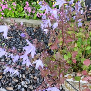 こんにちは♪ 今朝の花壇 1️⃣カンパニュラが満開 2️⃣これもカンパニュラ 沢山の種類があってわからない❣️ 3️⃣垂れ下がります 花友の花 カンパニュラ アルペンブルー 4️⃣昨年の種蒔きからの スイートピー まだ咲き始めた所 5️⃣今日はニャンコの日 散歩道にくりだしたニャンコ 見ただけで6匹いました🐱 まだ居そうなんだけど〜🥹 色付いた枇杷と野蒜の花と昼顔の花 小さくカットされたけど😅