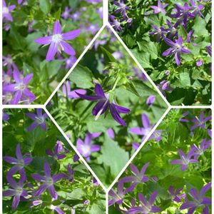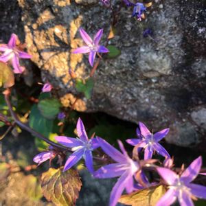 ꔛ𖤐˒˒* 💜光と遊ぶꔛ𖤐˒˒*💙 ⭐︎。.:*☆⭐︎。.:*☆。.:*☆。.:*☆。.:*☆。•*¨*•.¸¸☆*・゚ 待ちに待った、星型の花が咲きました( *ˊᵕˋ)✩︎‧₊ * ちょうど1年前、同級生宅から株分けされた、カンパニュラ アルペンブルー * あんまり綺麗に咲いてるから、思わず写真を撮らせてもらっていたら、お父さんがその場で根元から引っこ抜いてくれたもの * 花付きは本家にはとても及ばないけれど、咲いてくれて嬉しい💜