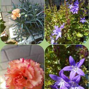 零れ種や冬越しで咲いたブルー、パープル系のお花たち💙💜 右上:ニゲラ 右下:ダンピエラ 左下:アゲラタム 左上:レースラベンダー 中央:カンパニュラアルペンブルー 最近にぎやかな姥捨山コーナーです😊