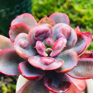 【エケベリア属 バロン ボールド】 Echeveria 'Baron Bold' 別名 バロンボルト 交配種(交配親 不明) 赤と深緑のコントラストが美しい? コブエケの【バロン ボールド】 花は赤に近いピンクらしいですが、 この葉に咲くピンクの花の様子を、 一度見てみたいものです💐 葉の真ん中の突起した瘤は、 パンプス(バンプス)と呼ぶそうで、 骨竜とも呼ばれるとの事🐲 何故このようなコブが出来るのか? 調べてみましたが 上手くヒットしませんでした 「コブの原因は諸説あり、詳しくわかっていませんが、奇形の一種の理解です 奇形というと異常のようにも聞こえますが、綴化、石化など斑入り種とならんで珍重されています」 【多肉植物専門店 ビスタ】 さんのブログより抜粋 https://blog.goo.ne.jp/vistajapan/e/44043ca054e68004aad929770f6110fd