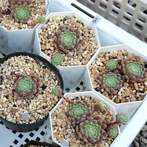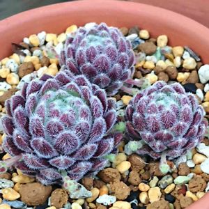 直径7.5cmの鉢にお一人様の 「センペルビウム パシフィックテディ」 (右上の子が普通) 長年育ててますがこんなに大きくなったのは初めてです♡♡♡ 周りに子株もたくさん(〃ω〃) モケモケの子に、萌え〜〜