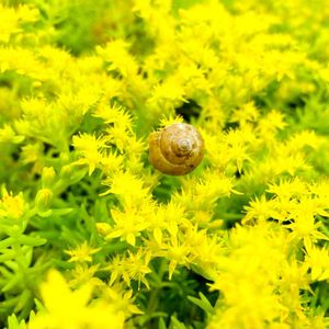 地を覆い尽くすように密集した小さな黄色い花をつける、「六条万年草(ロクジョウマンネングサ)」で、おはようございます💛🌱✨ 小さな蝸牛が一匹だけ、迷い込んだように柔らかな緑の多肉のカーペットに憩う光景は、童話の世界のように優しくて、引き寄せられるように目に留まりました🐌🌱☺️💞 "六条万年草"は、ヨーロッパ原産の常緑の多肉植物。 多肉質の葉は棒状で先が丸く、茎に沿って規則正しく六角形に連なっていました🌟 耐暑性や乾燥、耐寒性にも比較的強いようですので、GSの多肉植物マニアの皆様の中にもきっと、根強いファンがいらっしゃることでしょうね❣️ ー別名は、「サクサグラレ」、「コーラルカーペット」。 ー花言葉は、「枯れることのない愛」、「記憶」…他。