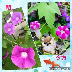 29日フクロウ祭り🦉 参加しまーす🎶 💓💓朝と夕方の朝顔の姿💓💓 今 まさにしぼんでるところ✌️右pic✌️ フクロウ🦉 ちゃんは金魚が気になるみたい💦