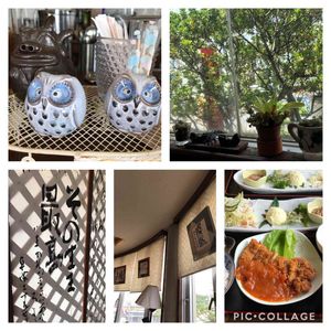 窓の外はホルトの木🌲窓辺に多肉植物ですが見えないかしら? ふくろう祭り🦉2投目参加 20年来年、夫と月1ランチに通っている、書と、植物が、心安らぐカフェ! ランチは、目に美しく、口に美味しく、身体と、財布に優しい、オーナー夫妻、スタッフが温かい❣️ で満点でしたが、6月いっぱいで、食事お休みにとの事、飲み物占いのみに😵沖縄県西原町在 私と夫の休日合った今日、久々にランチ堪能してきました🍱 偶然🦉の置物見つけパチリです!