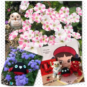 こんにちは 今日は熱風吹いてアチィ🥵 まつぴよサンにお願いごとしたらオマケでこんなにたくさん🎁ペコちゃんグッズにソクモンちゃん、有名な焼売まで頂いちゃいました😍 嬉しいなぁ🥰ありがとうございます♪ さっそくフクロウちゃんで 🏷フクロウ祭参加します☺️ 紫色のお花は📛何だっけ🤔 桃色ハート💕は陶器のフクロウさんと一緒です! ハート模様が薄いのもあるわ😅なんでかな🤔 🏷ソクモン祭りも勝手に付けちゃいました🙏