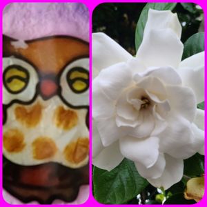 お出かけ先にて、白いお花💕くちなしの花でしょうか?咲いていました♪☺ 松ぼっくりフクロウとフクロウピックで🏷幸せを呼ぶフクロウ祭りと🏷ふくろう祭りに参加させてください🦉🦉🦉🎶