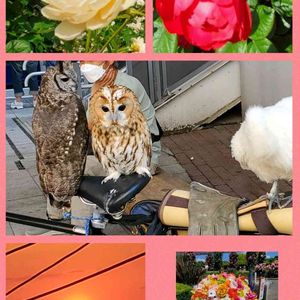 🏷️ふくろう祭り参加させて頂きます😊 昨日の山下公園でふくろうと白い鳥を自転車🚲️に乗せて散歩していた方が居ました😍 ふくろうちゃん大人しいですね🥰 左下↙️きょうの夕陽🌇です 丁度ベランダに出たら見えたのでパチリ🤳 電線がなければ〰️😅