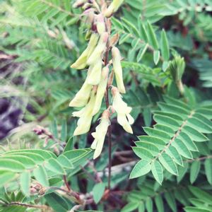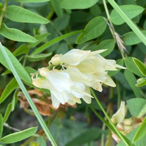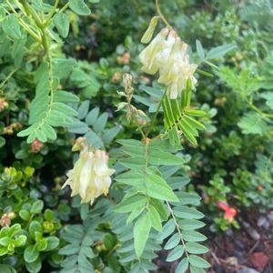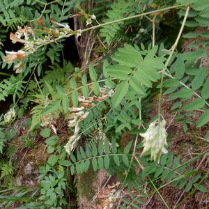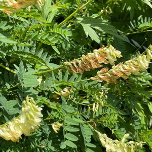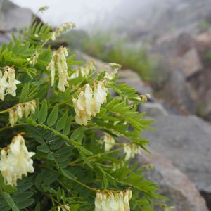イワオウギ(岩黄耆) マメ科 本州中部以北の高山草原に生える。代表的な高山植物。 株の根元から茎を群生し、6~10対の小葉のある羽状複葉を互生。 茎頂と葉腋に長い総状の花穂を出して、クリーム色の蝶形花を多数つける。