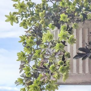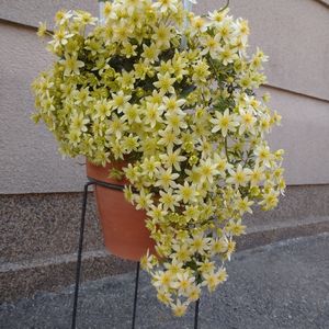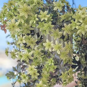 クレマチスピクシー天使の鈴 常緑タイプで 冬も葉を楽しみ水やりをしていました。 春につるを伸ばして今年も咲きました💚 小さな株にたくさんグリーンの花🧚♂️