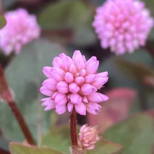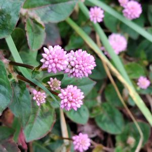 溝の奥でど根性で咲いています😊 ヒメツルソバ。 タデ科イヌタデ属のお花。 まんまるピンクがかわいいお花です。花もかわいいですが、V字模様の葉っぱも要注目🤗