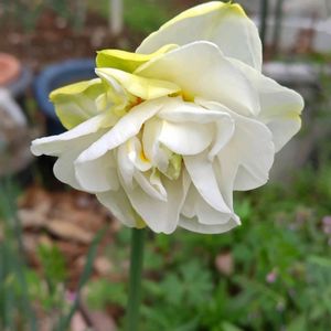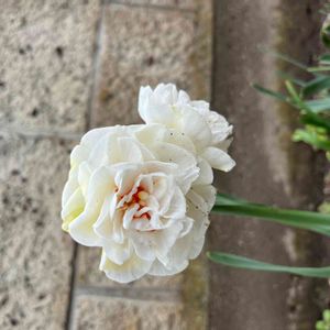 八重咲きスイセン ~ホワイト ライオン~ 我が家🏡では スイセンの種類は あまり多くありません 😥 ですが、何故か? 牡丹の横に 主のように 鎮座しております 💕 花数は 少ないものの、大きくて威厳のある その姿には、毎年 関心するばかりです 😲 🏷月曜日を爽やかに