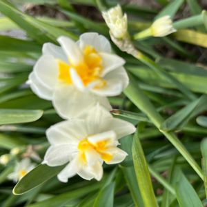 3/12 (水) ☁️ ①②🌿💚八重咲き水仙フォンシオン💚🌿 ※昨年3/6蕾〜3/17開花👀 ③🤍💛🌿八重咲き水仙🌿💛🤍 ④🌿💛🤍水仙🤍💛🌿 3/12付📷📱散歩道〜歩道沿い〜花壇💛🤍🌿