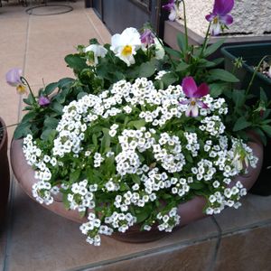 こんにちは🌞 朝からお天気だったけど、どんよりと雲って来ました☁ パンジー&ビオラをメインに寄植えしたのにアリッサムがメインの様にモリモリになりました💮 これはこれで可愛い〜😍