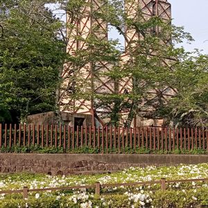 買物へ出かける途中の夕方 反射炉と白いツツジ のある風景 なぜか植え込みのツツジは 全部地味な白(他の色と交わったらしいほんの少しだけ赤) 見事に白!ずーっと続く白♡♡♡♡♡♡ きっとこの建築物には赤よりも白一色が似合う と考えた人が 全部白いツツジを植えて と指定したのでは 薄茶色の建物に 白と新緑の緑 初夏の色