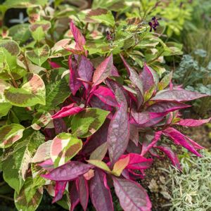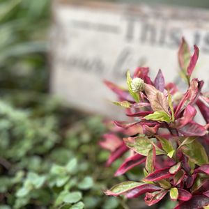 こんにちは 蒸し暑い1日です💦 冬越しチームのカラーリーフたち アルテルナンテラ コタキナバル(斑入り赤葉千日紅)¥50🤣 パープルファウンテングラスの株元にジュズサンゴ絣 クロロフィッツムスターライト ヨウシュコバンノキ ピンクの葉っぱが可愛い みんな元気になってきた 🏷️レスキュー