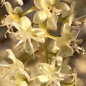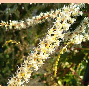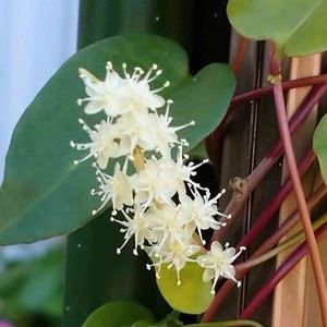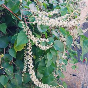 散歩の途中🚶♂️ 見て見て、径5㎜🤣 こんなに可愛い花です🥰💕 観賞用、食用です。 ツルムラサキ科アカザカズラ属 つる性多年草 藜蔓 別名:オカワカメ 葉が多肉質で、加熱するとぬめりが出てワカメのような食感になる。 原産地:南アメリカ 開花期:9-12月 葉腋から長さ6-30㎝の穂状の総状花序をだし、白〜クリーム色で芳香のある径5㎜ほどの花を多数つけます。