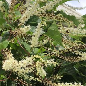 モフモフのモンスター⁉️ 白い大きなムックのような雲南百薬/オカワカメの花がこんなに…😳 ツルムラサキの仲間のスーパー野菜とか! (葉も茎も根も食べられる) グリーンカーテンにもなるそうです‼︎ 効能はお調べください🤗