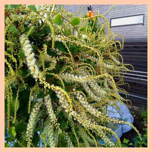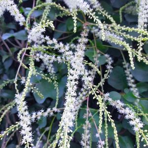 今日もおつかれさまでした… 雨のやみ間に少し散歩☁ ご近所のお宅の庭で見つけたフサフサに垂れ下がる花✨ 小さな花が集まってとても綺麗で… 「アカザカズラ」別名「雲南百薬」「オカワカメ」🍀 以前、違うところでいただいて食べた事があります🍀 食べたのは葉っぱですが花がこんなに綺麗だなんて…感動物✨✨✨ 珍しい植物をたくさん育てているご近所さんです😊
