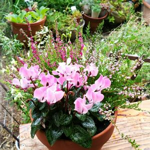 No 495 雨降りの中、ガーデンシクラメンとカルーナを寄せました。 ピンクがかわいい💕
