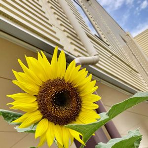 画像1.2/ひまわり♪ 2m超えの大きなひまわり🌻🌻🌻🌻🌻 母の入所先のホームで咲いていました。 画像3/今日の収穫♪ キュウリがお疲れ気味であまり大きく成長しなくなりました。 画像4/大葉♪ 虫食いボロボロの大葉でしたが、元気に復活しました〜 画像5/キンセイマル♪ 子吹き、ちょっとは成長したかな?