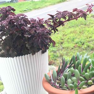 葉の色とモケモケした赤い茎がたまらなく好きなんだけど もっさりと育てることが出来ない子 水加減が難しくて 毎日何回も目にするキッチンの窓辺に下げてるけど それでもうっかり水切れですぐ葉っぱが枯れたり 蒸れにも弱いし ほんと、手のかかる子なんだからぁ〜(人´∀`)