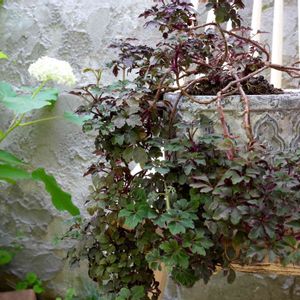 名ばかり360度寄せ植えの、今裏になっているところにあるお気に入り。 濃い紫のミカニアデンタータとクローバー ティントワイン🍀 一応近寄ると上から見えるからいいんだ…いいんだ…