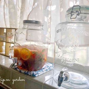 冷蔵庫を何度も開けなくていいように… . キッチンにハーブウォーター🌿 . ローズヒップ&ピーチティーにレモン、オレンジと庭のアップルミント、タイムを入れて(*^^*)