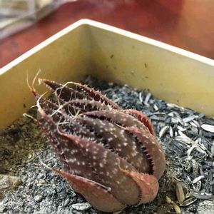 前回名前教えてくださいで初投稿したのですが、写真の貼り付けがよく分からなくて拡大できない写真になってしまったので再投稿しました。あれからくださった方にも聞いたのですが多肉植物なんだけど名前は分からないそう。今にもグワッて口を開けそうでちょっと怖い💦先っちょモケモケ毛が生えてます。