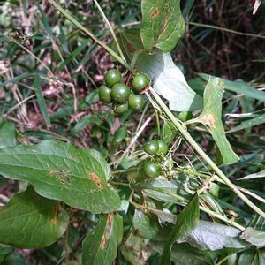 里山の林縁に 青い実を見つけました💙 シオデの実の様です。 サルトリイバラ科 つる性の多年草。 他のものにからみつく 花は、小さく緑色で丸い花序を作る。 果実は、黒く熟す。 美味しそうに見えますが?