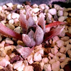 ハオルチア(オブツーサ)です。 桃色になるという、、なるのかな。なるほど。。 徒長してしまい脇芽が出ています。