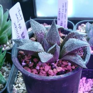 ハオルチア(パープルレンズ≒雫絵巻)です。 再登場です^^ 薬剤の色染みが気になりますが、元気に育っています。。 欲どしい事を言うと、もう少し強い光がいるのか、色が浅いですね。また次回^^/