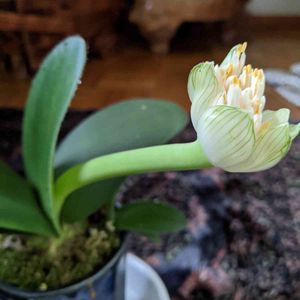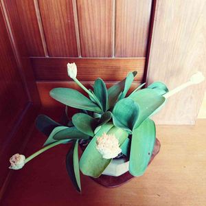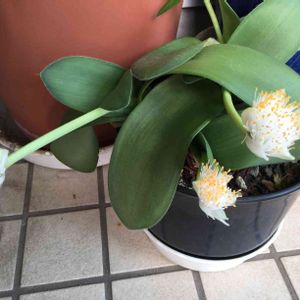 おはようございます🐱 一年前の写真です😽 マユハケオモトかな❔🐱 3~4 年前🐾もよりの薬局から死んじゃいそうな鉢を救出😓この時この子ゎ君子蘭だと信じてた(笑) 大事に育ててたけど🐾夏に枯れた❔😫と思い😢玄関前の繁みに置いたら葉っぱが出てきたので✨🐱良かった〰️と喜んでたら🎵蕾まで🎶🎶 でも咲いたら君子蘭じゃなかったから❔🐱❔❔🐱この何年か君子蘭だど思って育ててたのに❔🐱なんで。。。❔🐱 今年ゎ春先に移動中に鉢を落としてしまい😱葉っぱも折れて😢まだ回復してません。 元気になる方法😿教えてください😽🐾