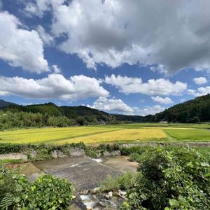 窓を開ければ見渡す限り黄金色🌾 もう稲刈りが済んだ田圃もあります 猛暑が実りを早めたのでしょうね