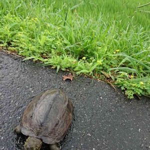 おはようございます☁️ 家の脇の田んぼから大きなかめが道路横断中👀❕ 外来種だぁ🐗🐗