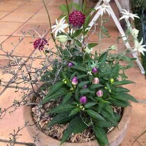 たまに行くスイーツスイーツ店さん🍰🍩の 寄せ植えです。 私の好きなお花 𖤣𖥧𖥣。𖥧𖧧 ✿ スカビオサ(ジェラートブルーベリー) ✿ フランネルフラワー ✿ トウガラシ