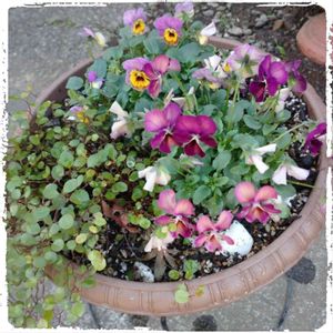 徒長して特価品で売られていたビオラ。 摘心して葉っぱがこんもり🌱 花も着いた🎵 庭にあったシレネユニフローラ・クローバー・セダムと寄せ植えに🤗