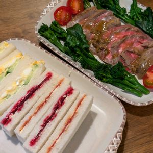 merryclisms🎄🎅 我が家のクリスマスパーティー🎉 1️⃣庭のブロッコリーと なんちゃってローストビーフ 自宅収穫の スイカジャムサンド ローゼジャムサンド 2️⃣とんでもなく早割で注文していたケーキ 美味しくいただきました😍 映っていませんがチキンもあります😘 素敵なクリスマスを💕