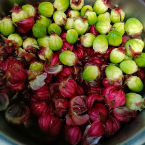 ❀🔴ローゼルの花と実🔴❀ &乾燥ローゼル・ジャム ハイビスカスローゼルの実が大きくなり早くに…乾燥ローゼル・ジャムが漸くできました! もう少し早くに収穫したほうが良かったみたいです! ジャムにしたローゼルですが、赤いがくとほうですが、スジが硬くなり煮たのですが、ジャムの中に芯みたいな物体が口に残る感じです!残念! でも、甘酸っぱく美味くできました! トーストにして朝食で食べてみたいと思います! 2024.10.15.📸pic