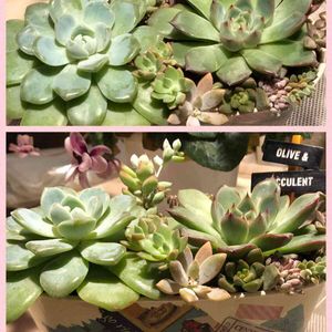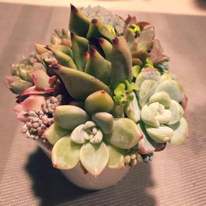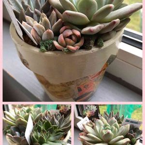 お疲れ様です❣️ この夏に星になった子⭐️ビックリ‼️する位色々居ますが左のアイシーグリーンがお一人様の鉢からはみ出てたのでYUMIKOさんから頂いた鉢にイン花うらら達と一緒に仕立てましたが…😅この冬で徒長する気配満載です💦しかも触り過ぎて粉が落ちてしまった🤣💧