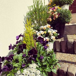 玄関の階段の寄せ植えたちです〜満開になってきました♪