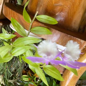 小さくて、可愛い花です。蘭の種類かなと思いますが。花はカトレアに似て、葉っぱが特徴的?葉っぱが伸びて下がりその先に花をつけています。
