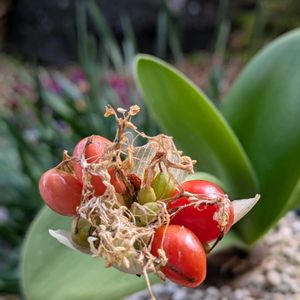 マユハケオモト 種が赤くなりました 蒔いたら発芽する? 表皮を剥いてみようかな〜🙂